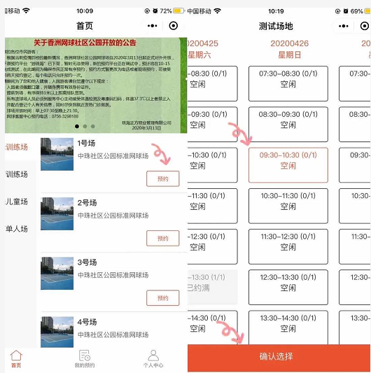 返回主頁面,共有18個網(wǎng)球場地可供選擇;點擊球場右邊的【預(yù)約】,進入空余球場預(yù)約頁面,選擇球場;點擊【確認選擇】。