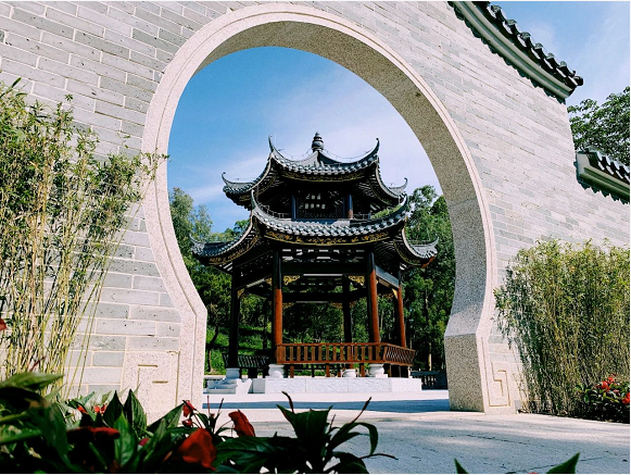 往前走可通過開闊的湖面,遠觀嶺南風格景觀的月門、水榭、五孔橋,月門將瀲滟湖水與青蔥山林優(yōu)美分割,形成極簡的禪意味。