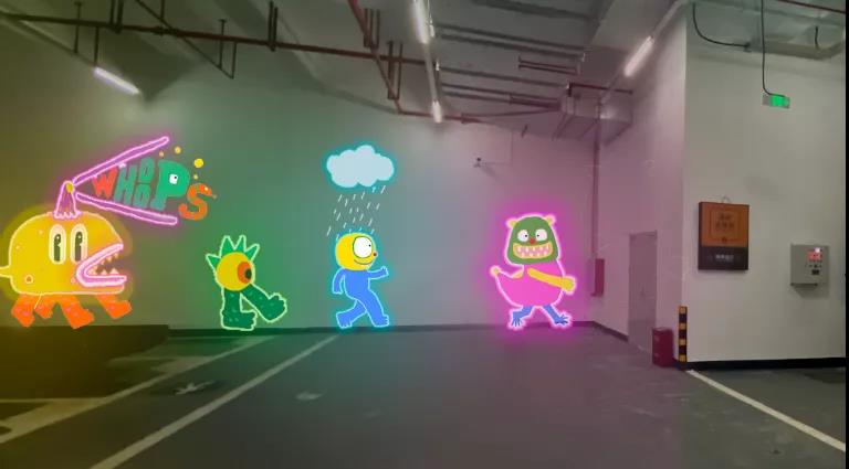 場內(nèi)一共繪制了7組壁畫,高度近4米。更別致的是,壁畫以外還加裝了霓虹燈帶,提升了壁畫的視覺沖擊力,搞怪有趣,十分可愛。