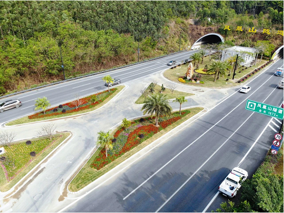 鳳凰山隧道口作為重要節(jié)點之一,植物使用比較單一,為解決植物單一枯燥的問題,通過朱蕉、朱槿及四季海棠色帶等鮮艷開花植被進行裝飾,營造亮點氛圍。同時,重鋪草皮,種植朱蕉、朱槿等,解決草皮大面積裸露,植物長勢較差問題,提升環(huán)境品質。