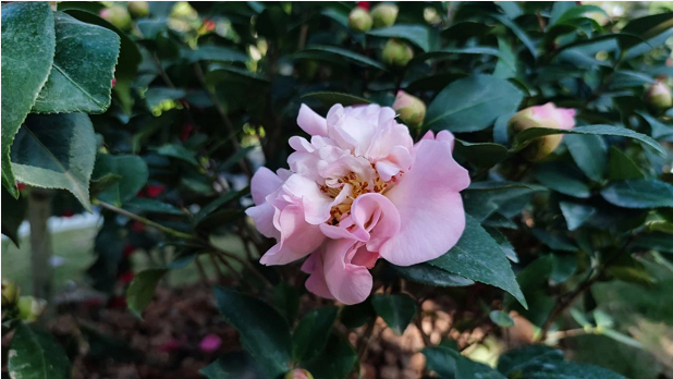 盛開的山茶花恍如赤霞彩云飄,葉片濃綠而有光澤,花形艷麗繽紛,嬌艷的茶花氣味芳香襲人,為海天公園增添了濃郁的年味~