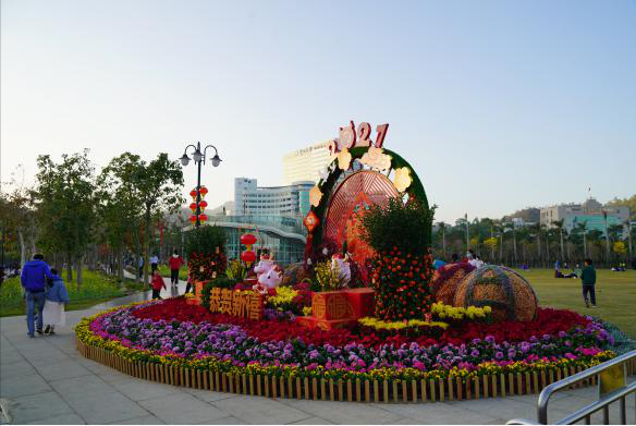 海天公園正門廣場(chǎng)的“時(shí)來(lái)運(yùn)轉(zhuǎn)過(guò)潮年”、南門門樓的“牛轉(zhuǎn)乾坤福滿門”以紅色為主題,將新春與廣府、海洋、鮮花等融合,展現(xiàn)珠海城市的浪漫、青春、活力,樹(shù)梢上一串串大紅燈籠,飽含著新春的喜慶與祝福,繽紛的茶花、熱烈的勒杜鵑、絢麗的波斯菊、金黃的油菜花……在溫潤(rùn)的海風(fēng)中,享受宜人美景。