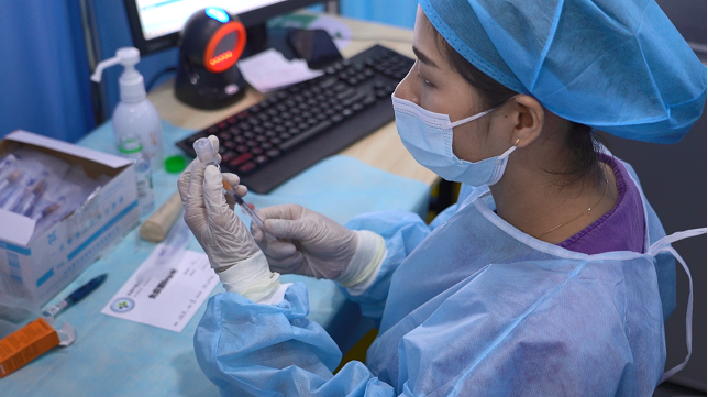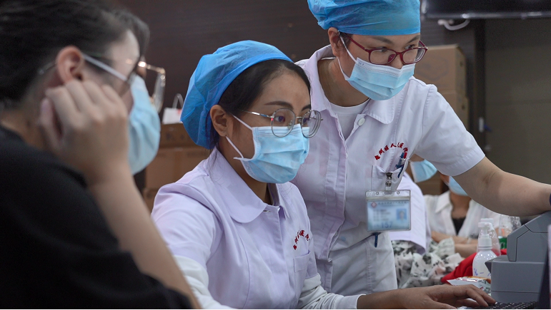 進(jìn)入接種區(qū),醫(yī)護(hù)人員再次核對(duì)身份,為對(duì)象接種新冠疫苗。