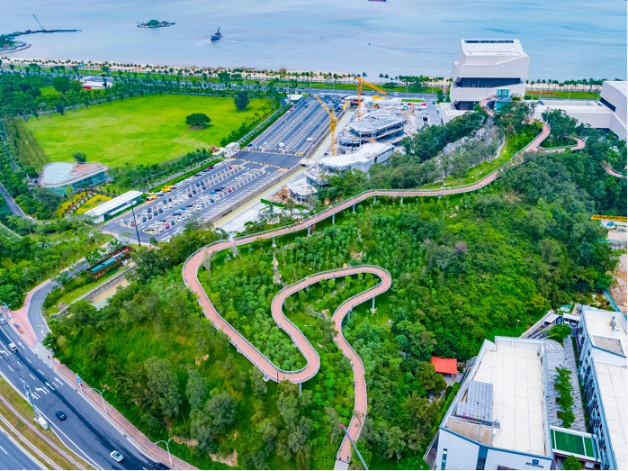 市民游客可從地面入口(珠海規(guī)劃展覽館北側(cè))徒步登上棧道,信步于山海之間,在呼吸“健康”的同時(shí),將海天公園、日月貝、雞公山瀑布等城市美景盡收眼底,達(dá)到觀水觀城、通山達(dá)海、步移景異的景觀效果。