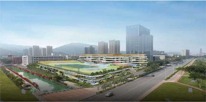 項(xiàng)目按一流標(biāo)準(zhǔn)配建教學(xué)樓、綜合實(shí)驗(yàn)樓、文體綜合樓、地下人防設(shè)施,以及與周邊環(huán)境融合協(xié)調(diào)的校園綠化景觀等,整體設(shè)計(jì)既體現(xiàn)現(xiàn)代化與智能化,又富有建筑美、空間美、人文美和藝術(shù)美。最引人注目的,是建在文體綜合樓頂?shù)沫h(huán)形田徑運(yùn)動(dòng)場,這是香洲區(qū)學(xué)校配建的第一個(gè)“空中運(yùn)動(dòng)場”,通過“向天空要面積”,讓整個(gè)學(xué)校“變大”、“變寬”,為師生提供足夠的運(yùn)動(dòng)空間,也為校園增添別樣的美感。