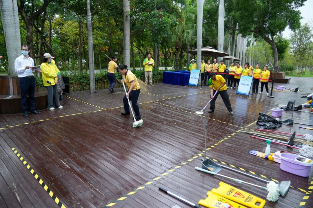 保潔組競(jìng)賽分“自我形象展示”、“知識(shí)必答”、“實(shí)操演示”三個(gè)環(huán)節(jié)進(jìn)行。6組隊(duì)伍在進(jìn)行風(fēng)采展示后,展開(kāi)了激烈的知識(shí)問(wèn)答比拼。面對(duì)清潔劑配比、不同擦拭布與清潔劑的使用場(chǎng)景等提問(wèn),參賽選手應(yīng)對(duì)自如,從容作答。實(shí)操環(huán)節(jié)中,選手們展示了刮拭玻璃、拖掃落葉、編制大掃把等技能,表現(xiàn)出了優(yōu)秀的專業(yè)技能水平。