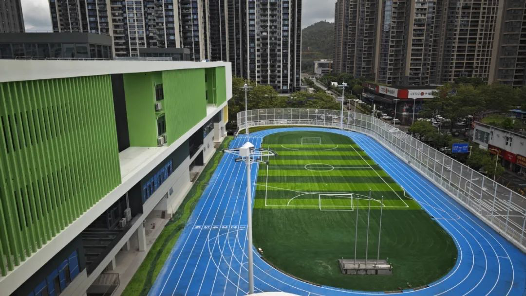 容國(guó)團(tuán)中學(xué)的整體設(shè)計(jì)既體現(xiàn)現(xiàn)代化與智能化,又富有建筑美、空間美、人文美和藝術(shù)美。最引人注目的,是建在文體綜合樓頂?shù)?00米環(huán)形標(biāo)準(zhǔn)田徑運(yùn)動(dòng)場(chǎng)。這是香洲區(qū)學(xué)校配建的第一個(gè)“空中運(yùn)動(dòng)場(chǎng)”,通過(guò)“向天空要面積”,讓整個(gè)學(xué)校進(jìn)一步“變大”“變寬”,為師生提供足夠的運(yùn)動(dòng)空間,也為校園增添別樣的美感。