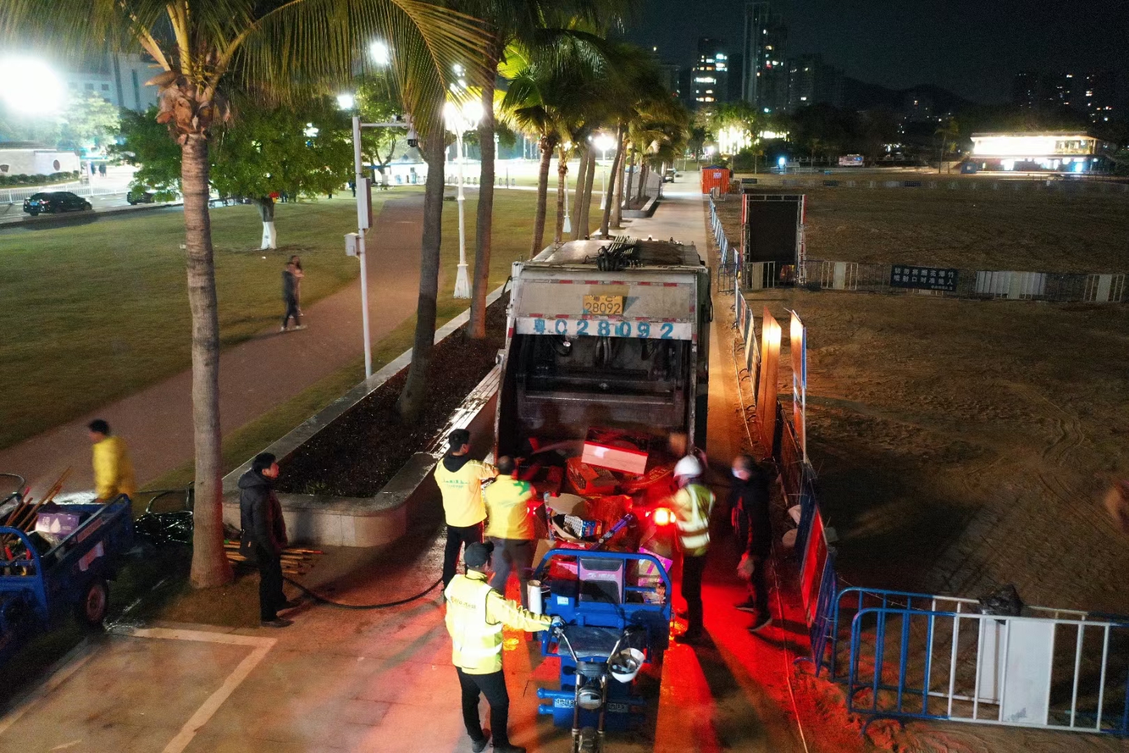 本次煙花燃放清理工作的難點(diǎn)區(qū)域是海天公園沙灘。大型煙花燃放后,大量的碎屑會(huì)隱藏在沙子里。為此,保潔清理隊(duì)伍分條塊對(duì)海灘進(jìn)行仔細(xì)梳理清潔,靠人力一點(diǎn)點(diǎn)撿拾,將沙子里混雜的煙花爆竹碎屑梳理出來(lái),然后用拖運(yùn)車轉(zhuǎn)運(yùn)至集中存放點(diǎn)。