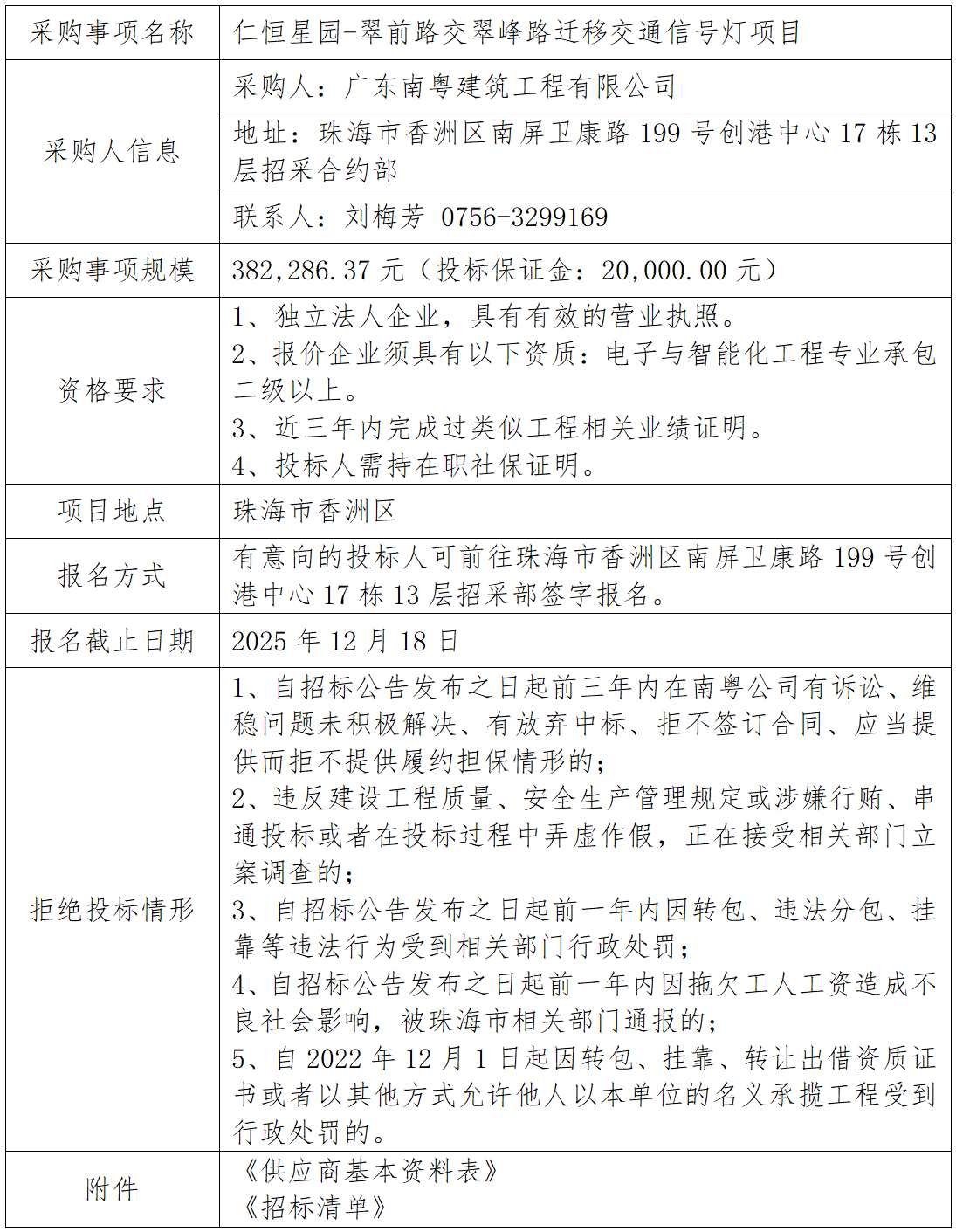 仁恒星園-翠前路交翠峰路遷移交通信號(hào)燈項(xiàng)目 專欄:工程招標(biāo) 發(fā)布日期: 2025-12-15 作者:招采管理中心 附件:供應(yīng)商基本資料表 附件:三臺(tái)石路仁恒星園-翠前路交翠峰路遷移交通信號(hào)燈項(xiàng)目-招標(biāo)預(yù)算價(jià)清單 返回列表 上一篇:沒有了 下一篇:廣昌保障房配套基礎(chǔ)設(shè)施項(xiàng)目施工總承包-混凝土材料采購(gòu)(預(yù)算、稅率變更)