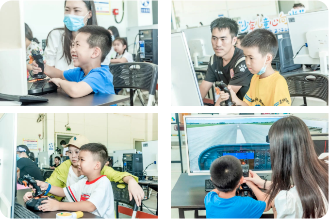 隨后,進入到了航天知識分享和模擬器實踐操作環(huán)節(jié),資深的專業(yè)航空講師不僅給孩子們分享航空知識,還介紹了模擬器的綜合儀表,導(dǎo)航儀表、油門、操縱桿等結(jié)構(gòu)及其操作方式,小朋友們一邊認真地學(xué)習(xí)基本原理,一邊按照航空講師的步驟操作,完全沉浸在飛行模擬器、航模模擬器的現(xiàn)場實操中。“我也想開飛機在天上飛!”一個孩子興奮地對媽媽說道。