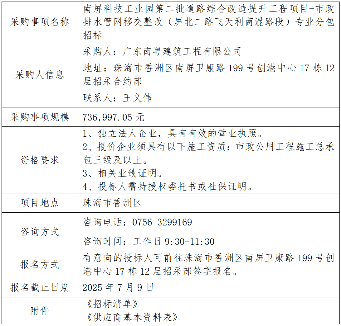 南屏科技工業(yè)園第二批道路綜合改造提升工程項目-市政排水管網(wǎng)移交整改(屏北二路飛天利商混路段)專業(yè)分包招標(biāo) 專欄:工程招標(biāo) 發(fā)布日期: 2025-07-04 作者:招采管理中心 附件:南屏科技工業(yè)園第二批道路綜合改造提升工程項目-市政排水管網(wǎng)移交整改(屏北二路飛天利商混路段)專業(yè)分包招標(biāo)清單 附件:供應(yīng)商基本資料表 返回列表 上一篇:南屏科技工業(yè)園第三批道路綜合改造提升工程-移交整改專業(yè)分包 下一篇:鳳凰谷項目高壓線遷改工程-工程資料整理服務(wù)(延期掛網(wǎng))