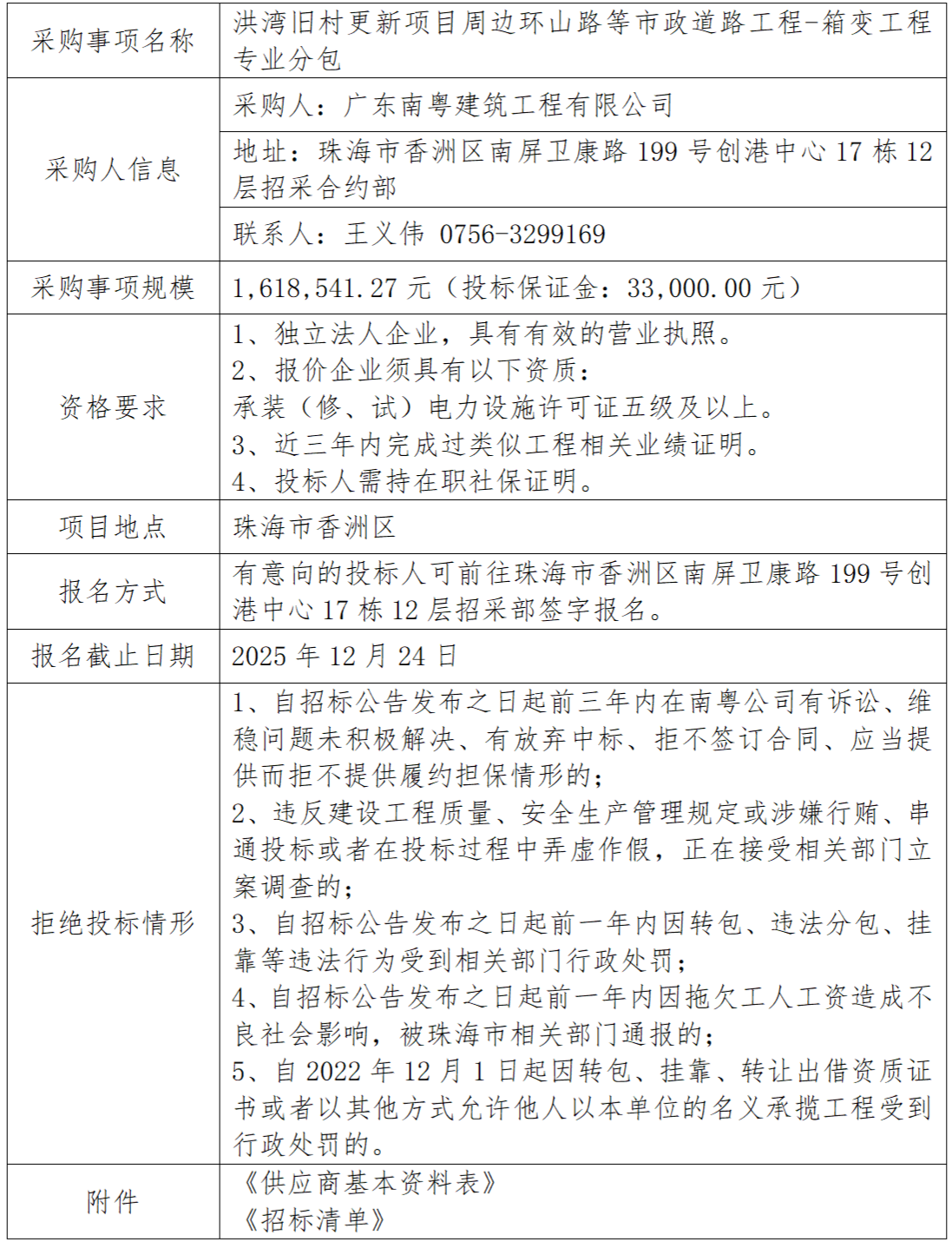 洪灣舊村更新項(xiàng)目周邊環(huán)山路等市政道路工程-箱變工程專(zhuān)業(yè)分包 專(zhuān)欄:工程招標(biāo) 發(fā)布日期: 2025-12-19 作者:招采管理中心 附件:供應(yīng)商基本資料表 附件:洪灣舊村更新項(xiàng)目周邊環(huán)山路等市政道路工程-箱變工程專(zhuān)業(yè)分包招標(biāo)清單 返回列表 上一篇:廣昌保障房配套基礎(chǔ)設(shè)施項(xiàng)目施工總承包--交通、安監(jiān)工程專(zhuān)業(yè)分包 下一篇:廣昌保障房配套基礎(chǔ)設(shè)施項(xiàng)目施工總承包-預(yù)制水泥類(lèi)材料采購(gòu)招標(biāo)