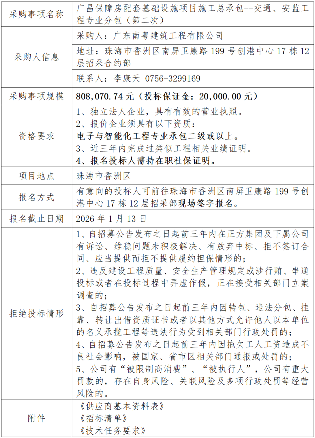 廣昌保障房配套基礎設施項目施工總承包--交通、安監(jiān)工程專業(yè)分包(第二次) 專欄:工程招標 發(fā)布日期: 2026-01-08 作者:招采管理中心 附件:供應商基本資料表 附件:廣昌保障房配套基礎設施項目施工總承包-交通、安監(jiān)專業(yè)分包招標預算價清單 - 空白清單 附件:招標技術要求(交通安監(jiān)工程) 返回列表 上一篇:廣昌保障房配套基礎設施項目施工總承包-食堂服務(第二次) 下一篇:廣昌保障房配套基礎設施項目施工總承包-模板材料采購