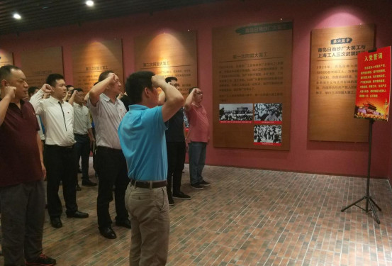 展演結(jié)束后,大家參觀了林偉民與中國早期工人運動史跡陳列館,集體瞻仰了中國工人運動著名領(lǐng)袖林偉明的銅像,深切緬懷革命先烈的豐功偉績。在講解中,大家了解林偉民發(fā)動和領(lǐng)導工人運動的事跡,學習林偉民偉大的革命精神和崇高追求。在香洲國土分局黨支部書記陳肇豪的主持下,全體黨員面向鮮紅的黨旗,神情肅穆、整齊站立、舉起右拳,莊嚴宣誓。
