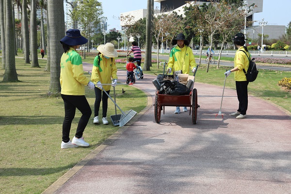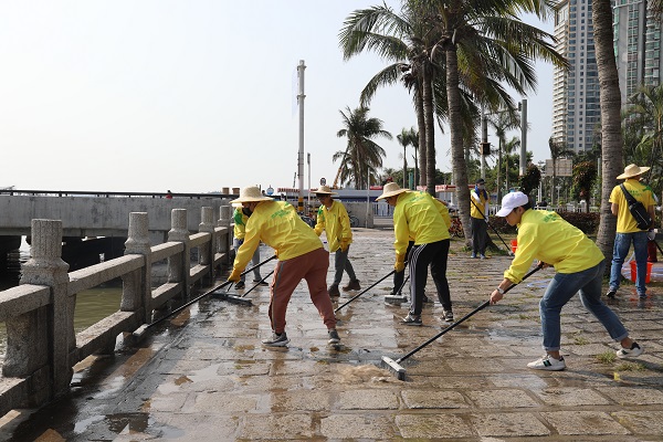 當(dāng)天上午8點(diǎn)40分,各支援人員已在海峽社區(qū)公園小廣場(chǎng)前集合完畢。講清注意事項(xiàng)后,各組人員就在小組長(zhǎng)的帶領(lǐng)下簽領(lǐng)好工具前往自己所負(fù)責(zé)的工作區(qū)域內(nèi)迅速開(kāi)展工作,長(zhǎng)長(zhǎng)的情侶路立馬被“小黃人”們占領(lǐng)。