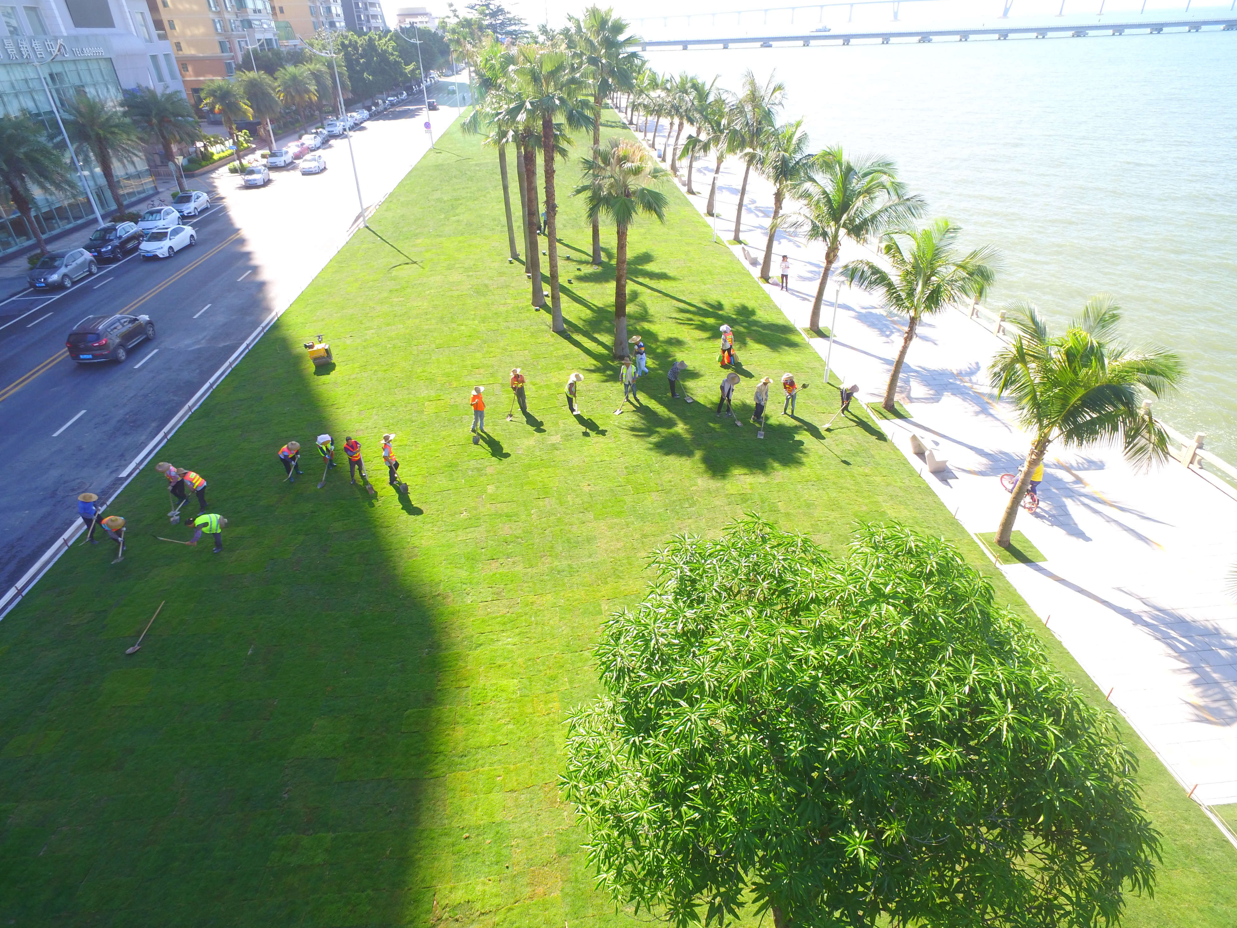 為積極相應(yīng)珠海市政府辦對情侶路(全球通大廈至拱北口岸段)環(huán)境景觀整治提升的工作要求,珠海市香洲正方控股有限公司(以下簡稱:正方控股)全力跟進(jìn)此次提升改造工程,高標(biāo)準(zhǔn)做好了裸土復(fù)綠、規(guī)范設(shè)置指示牌、植物支撐架拆除、綠植花卉管養(yǎng)提升、草坪積水處理及綠化微造型設(shè)計(jì)等各項(xiàng)工作。目前經(jīng)過4天4夜96小時(shí)的緊張施工,九洲驛站到海灣驛站的800米,共計(jì)1.92萬㎡的路段已基本改造完畢。