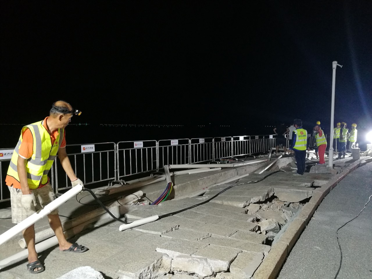 臺(tái)風(fēng)過境當(dāng)晚,正方城建公司迅速反應(yīng),連夜組織各部門員工前往受損嚴(yán)重的情侶路段進(jìn)行搶修支援。彼時(shí),“山竹”仍未完全退卻,狂風(fēng)暴雨里的海邊到處一片狼藉,受損路段仍未恢復(fù)通電。一片黑暗之中,他們卻組織有序地鋸木、鏟泥、清掃,即使身上的雨衣早已被雨水浸透,忙到連水都來不及喝一口,依然不停歇地與正方控股的應(yīng)急隊(duì)員堅(jiān)守奮戰(zhàn)在災(zāi)后復(fù)產(chǎn)的第一線。