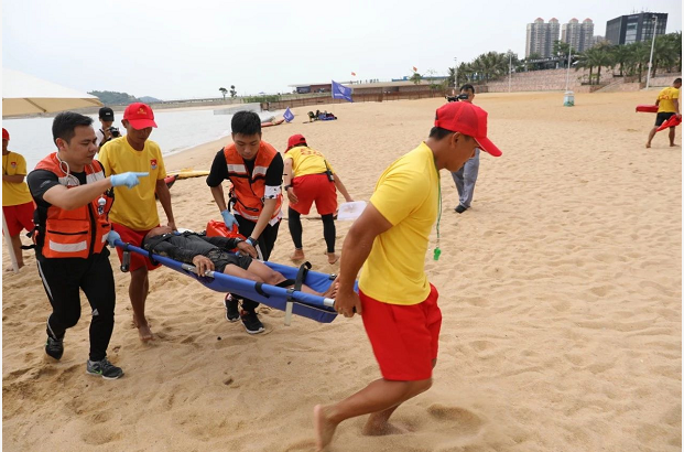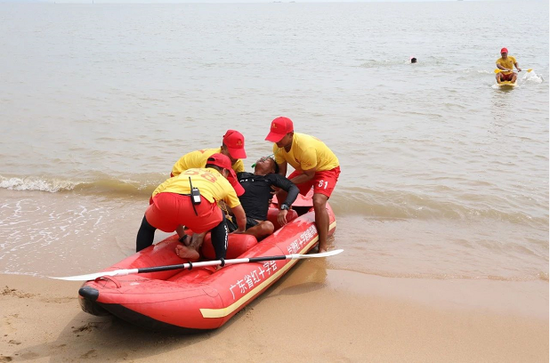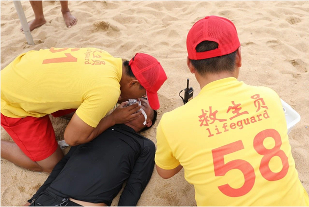 只見香洲正方救生員攜帶裝備從不同方向迅速向溺水者游去,最先到達(dá)的救生員將溺水者頭部托出水面,然后在其他救生員的共同協(xié)作下將溺水者抬入救生艇內(nèi),快速滑向岸邊的沙灘,就地進(jìn)行心肺復(fù)蘇搶救,香洲區(qū)衛(wèi)生健康局調(diào)派的醫(yī)護(hù)人員也趕到現(xiàn)場參與搶救。
