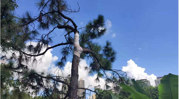 早年居住在此的住戶曾有牽拉電線等行為,在樹木表面留下了銹跡斑斑的傷痕。針對此類情況,施工方制定了相應(yīng)的保護修復(fù)措施:將樹干修平傷口后涂上樹枝修復(fù)液,用無紡布袋重新包扎,一來避免暴曬,二來保持布袋濕潤,有利于傷口自動生長愈合。