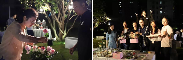 天色漸晚,嘉賓們?cè)谟貌瓦^(guò)后兩兩配對(duì),共同進(jìn)入到最后一個(gè)環(huán)節(jié)——共剪相思花。男生剪枝,女生布置,代表著相思的花朵也在二人的呵護(hù)下驚艷綻放。完成作品后是合照環(huán)節(jié),大家有說(shuō)有笑,與插好的花朵合影留“戀”。
