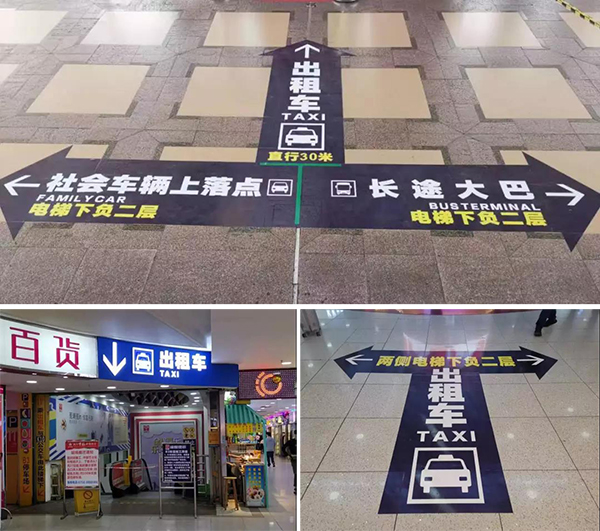 為更好地引導(dǎo)旅客乘坐出租車,拱北口岸綜管辦在口岸購(gòu)物廣場(chǎng)負(fù)一層多處設(shè)置了醒目的指示標(biāo)識(shí),指引旅客前往負(fù)二層出租車候車區(qū)。出租車接送乘客,需從東側(cè)情侶路進(jìn)入地下通道北側(cè)輔道,從而減少了迎賓路華潤(rùn)萬(wàn)家路段的出租車流量,減輕該區(qū)域的交通擁堵。