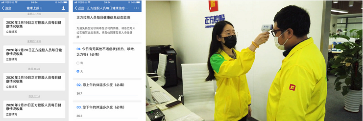 各部門、各板塊認(rèn)真統(tǒng)計(jì)員工身體健康信息,每日填寫并上報(bào)至人力資源管理中心。外來人員進(jìn)公司前必須佩戴口罩,接受門禁處紅外體溫測量并做好相關(guān)信息登記。