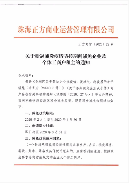 根據(jù)《香洲區(qū)關(guān)于幫扶企業(yè)抗疫情、渡難關(guān)、穩(wěn)發(fā)展的若干措施(珠香府〔2020〕8號(hào))》《關(guān)于落實(shí)減免企業(yè)及個(gè)體工商戶房租有關(guān)事項(xiàng)的通知(珠香財(cái)〔2020〕27號(hào))》等文件精神,我司積極響應(yīng)香洲區(qū)租金減免政策,現(xiàn)將租金減免細(xì)則通知如下:
