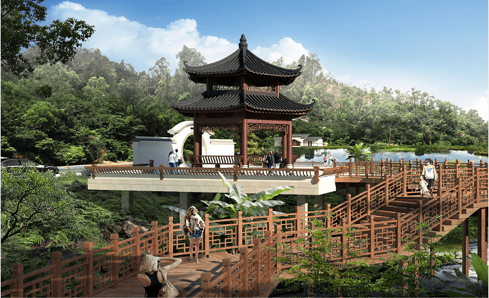 為實現(xiàn)這一設(shè)計思路,在市、區(qū)領(lǐng)導(dǎo)的關(guān)心指導(dǎo)下,香洲正方反復(fù)現(xiàn)場實地踏勘,通過最大限度地保留原有的山、水、草木等生態(tài)特征,不斷發(fā)掘原地貌特征中的景觀優(yōu)勢,結(jié)合傳統(tǒng)嶺南建筑風(fēng)格,對亭、臺、樓、榭、橋、廊、假山等景觀節(jié)點細心雕琢,令傳統(tǒng)建筑元素與現(xiàn)代舒適性需求充分結(jié)合,最終確定了總體規(guī)劃方案。