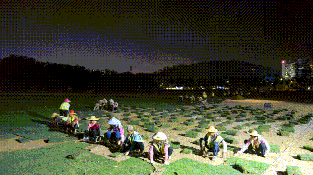 目前,海天公園管養(yǎng)提升項(xiàng)目進(jìn)度已完成75%,各種機(jī)械正在如火如荼運(yùn)轉(zhuǎn),各項(xiàng)工作正在快速有序推進(jìn)。其中,公園東部靠海天驛站一側(cè)已完成臺(tái)灣草草坪鋪設(shè),呈現(xiàn)出碧草茵茵的風(fēng)貌。在中央大草坪的鋪設(shè)現(xiàn)場,只見百余工人正在快速鋪草、壓土,一會(huì)功夫一塊平整無縫的新草坪就呈現(xiàn)在眾人眼前。