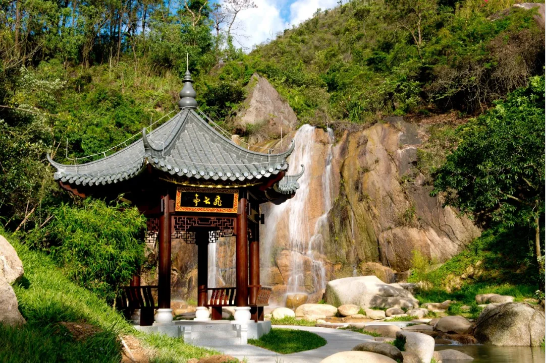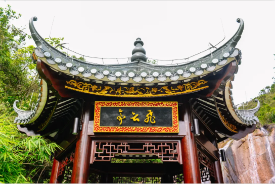 “雅琴飛白雪,高論橫青云”。出自唐代杜正倫“雅琴飛白雪”與詩仙李白“高論橫青云”兩處詩句,被譽為絕句佳對。此中有“橫琴”意源,故取其中“飛云”二字,既有飛云伴瀑布之意,也有飛“云”高論之意,寓意此亭為放飛思想出真知之處。至公園二期終點,與友人倚坐在飛云亭中,歇息拭汗,與鳥叫蟲鳴相伴,與瀑布相對,清澗凌冽,似銀河飛落。