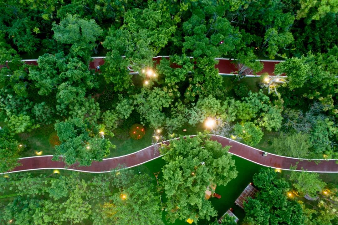 園內(nèi)樹木成蔭,花景精巧,可謂“人在園中走,如在畫中游”。在公園西南側(cè),由三處廢棄石坑改造成的雞公山瀑布,從30米高的石壁處傾瀉而下,若白虹起舞,營造出鬧市中的親水空間,展現(xiàn)出“銀河倒掛三石梁,香爐瀑布遙相望”的醉人美景。