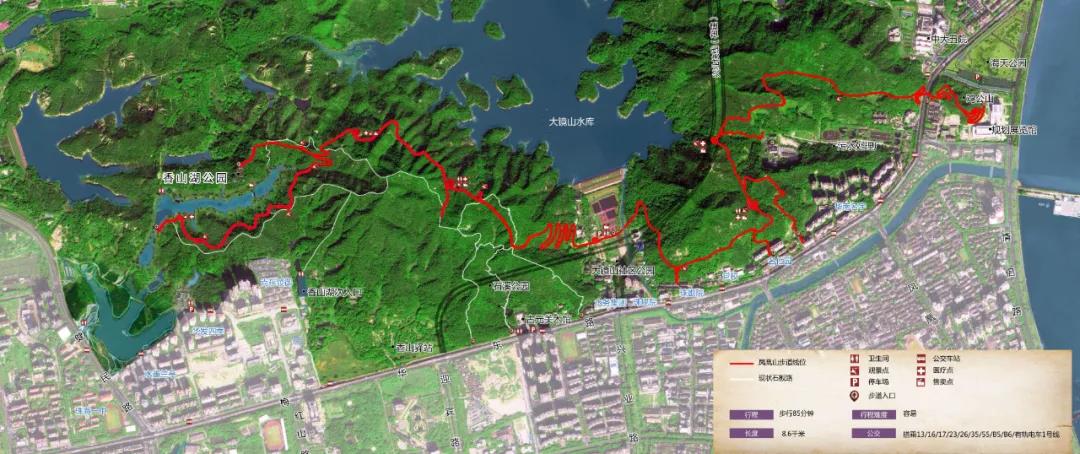 鳳凰山山地步道是珠海市重點民生工程,位于鳳凰山森林公園東南部,起點為香山湖公園,終點至海天公園,全長約8.6公里,步行全程約85分鐘。