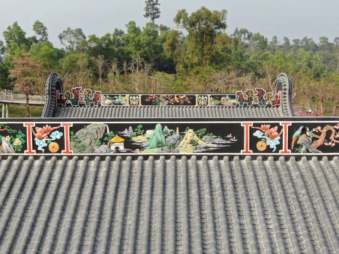 充滿嶺南建筑特色的鑊耳山墻、色彩艷麗的灰塑博古脊、工藝精美的木雕、磚雕、石雕等布滿整個三期廣場。