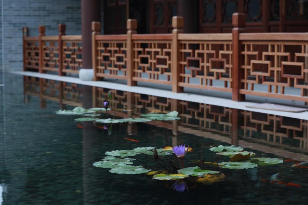 池中央矗立著一個造型獨特的“怪石”,陣陣煙霧隨風而散,含苞待放的荷花在“飄飄仙氣”的廊院內有一種朦朧的美感。
