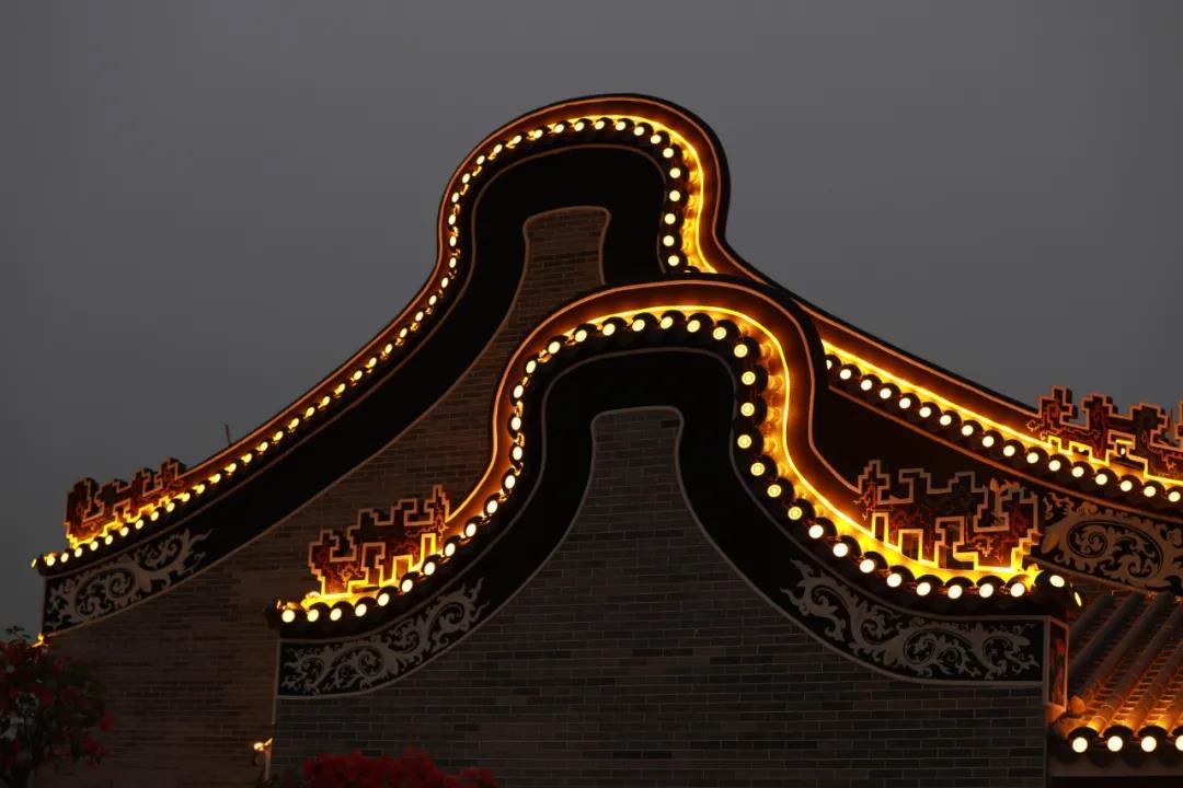香山湖三期的嶺南建筑燈光工程巧妙地將2400盞瓦楞燈和2350盞菊花燈安裝在屋頂和連梁處,白天與廊院的鑊耳山墻、博古灰塑脊融為一體,夜晚的燈光勾勒出屋頂、連梁的線條,使整組古建筑體現(xiàn)出端正沉穩(wěn)、格調優(yōu)雅的氣質。