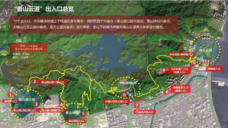 香山云道全程共設(shè)有11個出入口,自西向東分別為健民路入口、香山湖公園二期、三期入口、香山湖公園南門入口、香山驛站入口、大鏡山社區(qū)公園入口、工業(yè)北片區(qū)入口、華南名宇入口、污水處理廠入口、中大五院—梅華路入口、博物館入口。