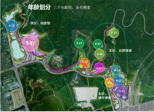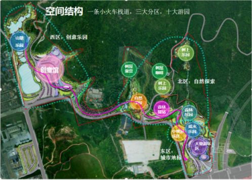 項目結(jié)合城、園、山、溪、林的地域特點,利用原有地形,根據(jù)不同年齡段兒童的需求,以“自然生態(tài)、科普教育、親子運動”為主題,建設(shè)西區(qū)創(chuàng)意樂園、北區(qū)自然探索、東區(qū)城市地標三大分區(qū),分散布局10個適合不同年齡段兒童游玩的游戲島,市民游客可通過一列小火車貫穿其中,沿途設(shè)置車站站點,形成一條便捷的動態(tài)交通流線。