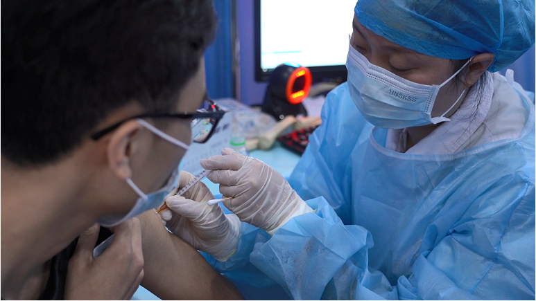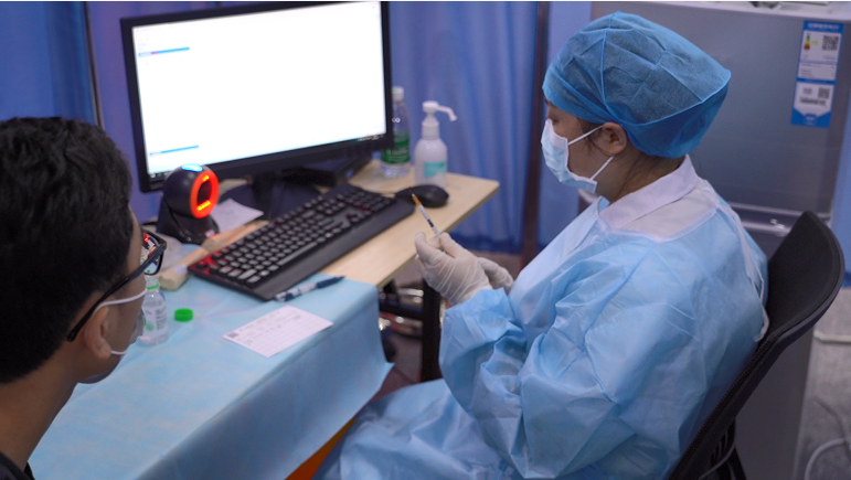 進入接種區(qū),醫(yī)護人員再次核對身份,為對象接種新冠疫苗。