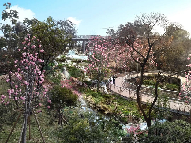 雞公山示范段采用中式園林設(shè)計(jì),山間水景,處處傾注匠心技藝,涓涓溪流順流而下,幽曲別致,信步棧道間。見(jiàn)水、聽(tīng)聲,卻不見(jiàn)石繞園林花樹,仿佛置身世外桃源。
