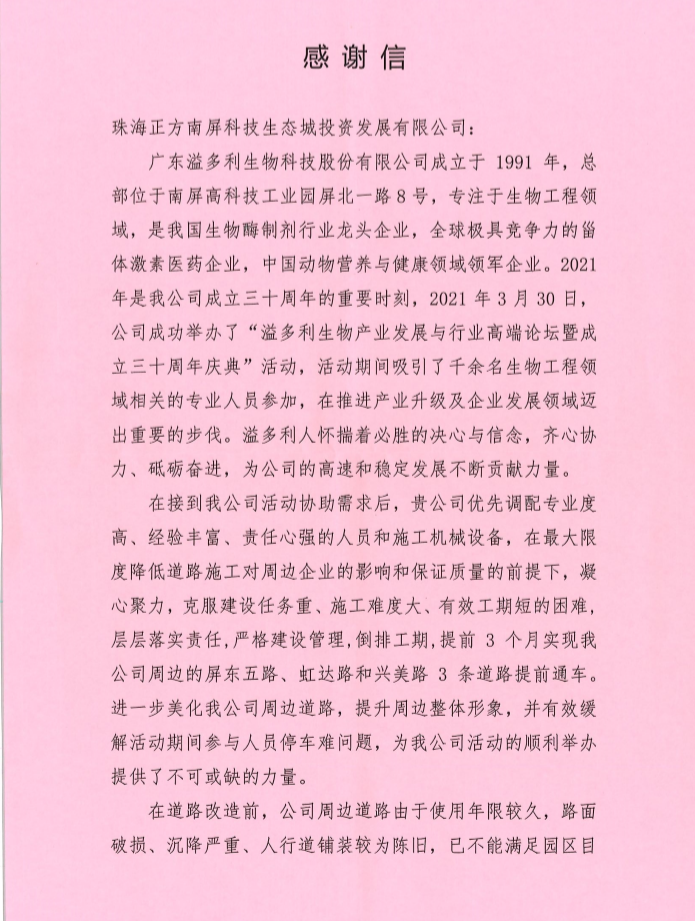 4月21日,廣東溢多利生物科技股份有限公司為珠海正方南屏科技生態(tài)城投資有限公司(以下稱正方生態(tài)城公司)送來一面錦旗和一封感謝信,為正方生態(tài)城公司的專業(yè)水平和匠心精神點(diǎn)贊,并致以誠摯的謝意,同時(shí)也見證了正方控股作為區(qū)屬國企為助推南屏科技生態(tài)城的發(fā)展升級發(fā)揮的重要作用。