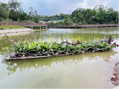 作品描述:作品融合了“雖由人作,宛自天成”的公園整體設(shè)計理念,以及公園尊重自然、保護自然,“節(jié)約優(yōu)先、保護優(yōu)先,自然恢復為主”的開發(fā)思路,利用枯木塑造了一條龍形的小景,并搭配四盞太陽能射燈,營造白天觀花、夜晚看光的氛圍?!叭嗽趫@中走,如在畫中游“,作品將城市建設(shè)與文化建設(shè)深度融合,將人與自然和諧共融的狀態(tài)體現(xiàn)到作品中,用精巧的技藝把最美的景色呈現(xiàn)給市民游客。