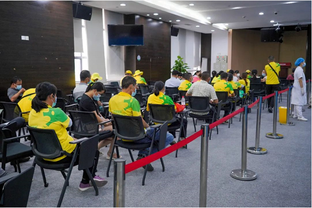 疫苗接種現(xiàn)場——正方·云創(chuàng)園14樓多功能廳,劃分為預(yù)檢分診區(qū)、信息錄入?yún)^(qū)、接種區(qū)、留觀區(qū)、不良反映觀察區(qū)、等候區(qū)等6大區(qū)域。在正方· 云創(chuàng)園1樓大廳,設(shè)置有2個等候區(qū),通過加強引導(dǎo)、分批分次等舉措,滿足符合接種條件的職工按需接種、高效接種。此外,在云創(chuàng)園內(nèi)還配備了一輛救護車,以確保疫苗安全接種。