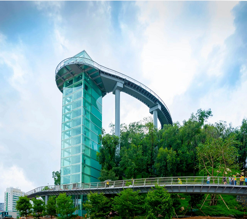 市民游客可從地面入口(珠海規(guī)劃展覽館北側(cè))徒步登上棧道,信步于山海之間,在呼吸“健康”的同時,將海天公園、日月貝、雞公山瀑布等城市美景盡收眼底,達到觀水觀城、通山達海、步移景異的景觀效果。