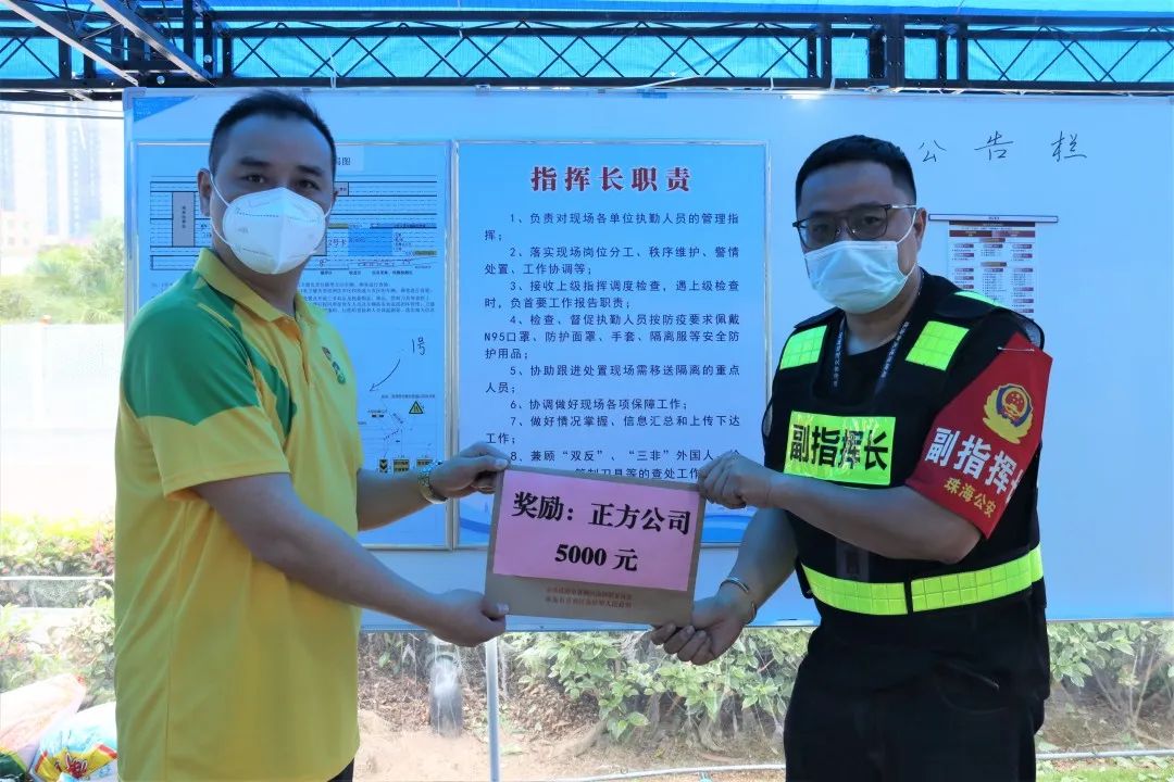 4月22日上午,在珠海南屏收費(fèi)站防疫檢查指揮部,正方集團(tuán)副總經(jīng)理凌安代表正方現(xiàn)代服務(wù)公司,接受防疫指揮部代表香洲區(qū)南屏鎮(zhèn)政府頒發(fā)的表彰,獎(jiǎng)勵(lì)正方現(xiàn)代服志愿者在南屏防疫檢查工作中高效排查并及時(shí)協(xié)助處理一名入珠抗原檢測(cè)異常旅客,斬?cái)嘁咔閭鞑ワL(fēng)險(xiǎn)的出色表現(xiàn)。