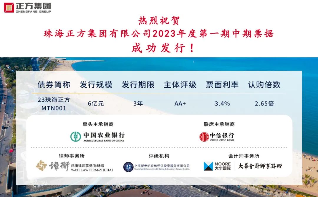 6月15日,正方集團(tuán)首期中期票據(jù)成功發(fā)行!該筆債券是正方集團(tuán)首筆公募債券,具有開創(chuàng)性意義。本次發(fā)行規(guī)模人民幣6億元,期限3年,票面利率3.40%,創(chuàng)區(qū)域內(nèi)同類企業(yè)新低,樹立了新的市場(chǎng)標(biāo)桿。