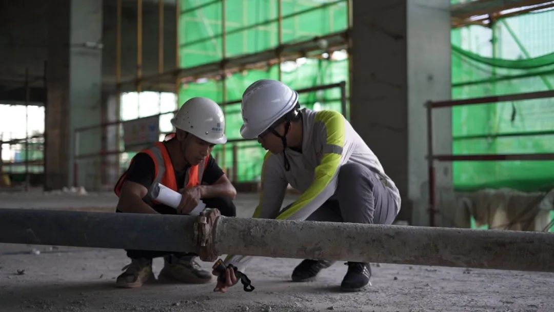 在一次項(xiàng)目巡檢中,黃之龍發(fā)現(xiàn)在使用地泵將混凝土輸送到施工樓層時(shí),由于輸送距離較遠(yuǎn),泵管和樓板之間鋪設(shè)了許多小塊木模板作為墊片。黃之龍敏銳地發(fā)現(xiàn)這樣的處理方式無(wú)法起到有效的固定作用,一旦泵送壓力過(guò)大,泵管可能發(fā)生位移引起爆管,造成成砼料飛濺,甚至砸傷工人的事故。