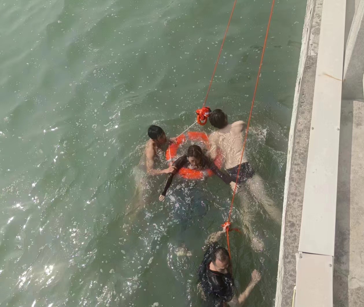 見此情景,寇建帥立刻用對講機呼叫附近項目部救生員黎啟成,自己奮不顧身跳入海中,奮力向落水者游去。
