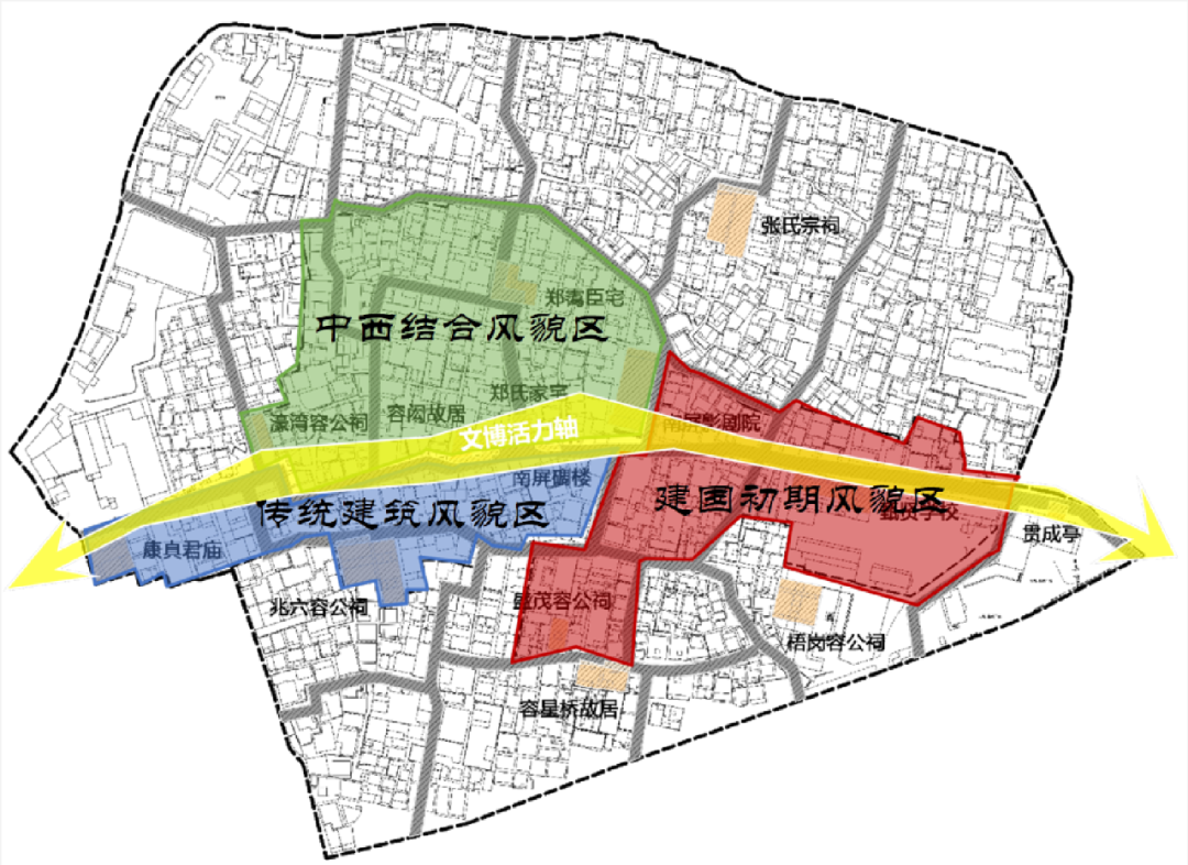在街區(qū)新格局的引領(lǐng)下,活化利用南屏歷史人文資源,形成三大主題區(qū)域。將歷史文化街區(qū)的活化與文化旅游緊密結(jié)合,以“三街串六巷”的現(xiàn)狀格局為基礎(chǔ),打造留學(xué)之旅、冠軍之旅、財富之旅、紅色之旅、藝術(shù)之旅和美食之旅六大特色旅游線路和一系列特色文化活動。線路穿過容國團紀念館、張氏公祠、梧崗容公祠、容閎圖書館、甄賢社學(xué)舊址等重要節(jié)點。