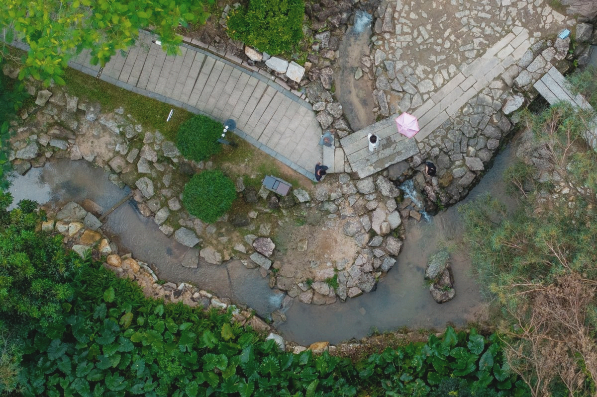 通過科學(xué)規(guī)劃引水造景補(bǔ)水設(shè)計(jì),從山腳水潭抽水至山腰水池,并對(duì)水池的水壩頂進(jìn)行精心改造,再現(xiàn)“曲水流觴”古韻,巧妙串聯(lián)起摩崖石刻、鮑俊雕像、鮑俊墓等文化節(jié)點(diǎn),形成脈絡(luò)清晰的景觀探訪動(dòng)線。這一設(shè)計(jì)不僅為山間增添了靈動(dòng)的水韻,讓市民游客能夠直觀感受自然之美,更暗合嶺南園林中“理水”的造園精髓,輔以重新整飾的綠植生態(tài)系統(tǒng),讓公園更顯嶺南風(fēng)韻,給人以沉浸式的觀賞體驗(yàn)。