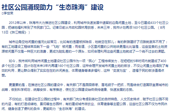 珠海特區(qū)報:社區(qū)公園涌現(xiàn)助力“生態(tài)珠海”建設 2017-08-15 珠海特區(qū)報:社區(qū)公園涌現(xiàn)助力“生態(tài)珠?!苯ㄔO 返回列表 上一篇:珠江晚報:把綠地福利帶到市民家門口未來三年珠海再添160個社區(qū)公園 下一篇:珠海特區(qū)報:社區(qū)公園好玩嗎?未來三年珠海將再添160個社區(qū)公園